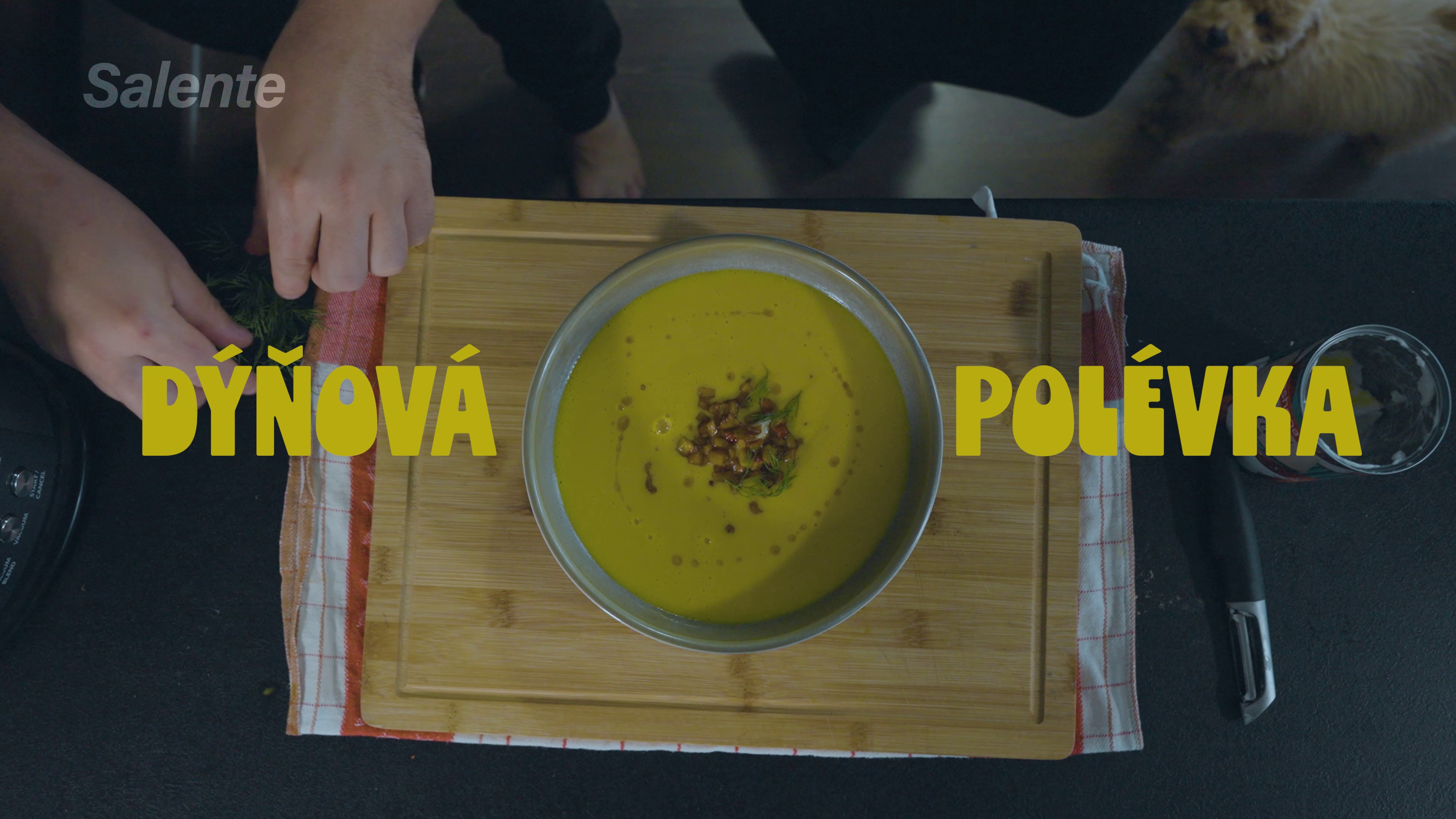 Do Salente Mixi 2L, vařícího a vakuovacího mixérunalijte 800 ml vody. Přidejte brambory, 300 g dýně Hokkaido, stroužek česneku a nakrájenou ⅓ chilli papričky. Zapněte automatický program Krémová polévka – přístroj směs postupně ohřeje, uvaří a nakonec rozmixuje do hladkého krému (cca 20 minut). - Dochucení a zjemnění