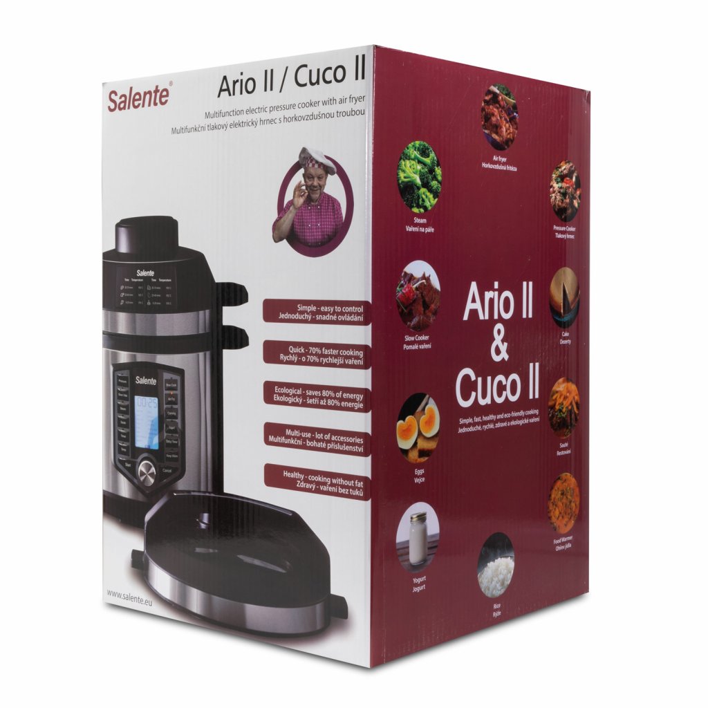 Salente Ario II navazuje na úspěšné modely multifunkčních hrnců Ario a Ario+. Oproti předchozím verzím má na přání zákazníků plynulou volbu teploty pro tlakové vaření, sous-vide, restování a pomalé vaření. Také se pyšní daleko větší nabídkou programů – číslo 32 v tomto případě vzrostlo až na 63, přičemž přibyly třeba módy pro vaření ve vakuu, zavařování nebo sušení. V neposlední řadě se pak může Ario II pochlubit modernějším designem a jeho tlaková poklice má nově tlačítko pro vypouštění páry.
