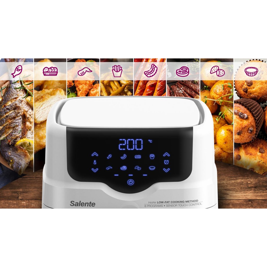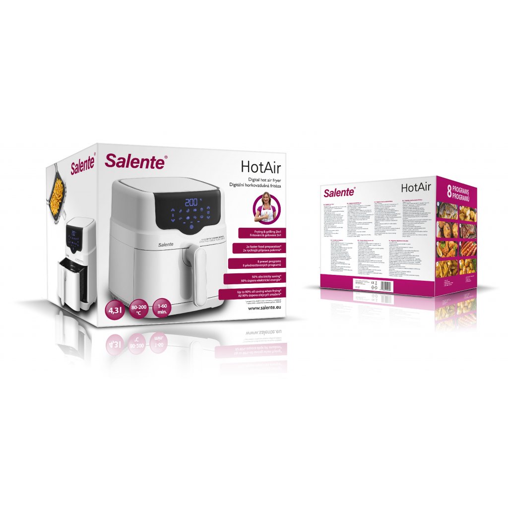 Horkovzdušná fritéza Salente HotAir splňuje současné nejvyšší nároky na zdravou a rychlou přípravu pokrmů a nabízí kombinaci dvou způsobů přípravy - fritování i grilování. I těm nejnáročnějším kuchařům a kuchařkám umožňuje nastavení teploty v rozsahu 80-200 °C v krocích po 5 °C a nastavení času přípravy pokrmu v rozsahu 1-60 minut v krocích po 1 minutě.