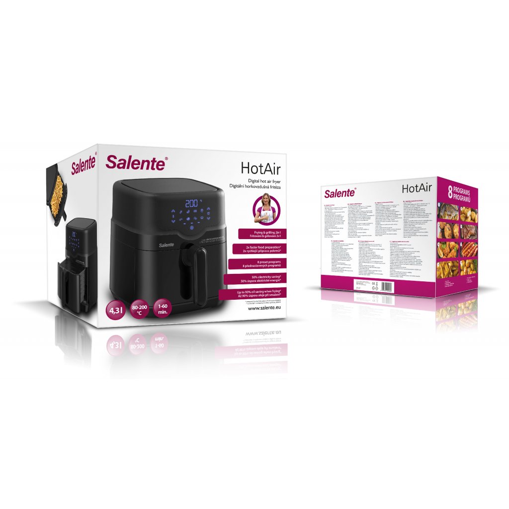 Horkovzdušná fritéza Salente HotAir splňuje současné nejvyšší nároky na zdravou a rychlou přípravu pokrmů a nabízí kombinaci dvou způsobů přípravy - fritování i grilování. I těm nejnáročnějším kuchařům a kuchařkám umožňuje nastavení teploty v rozsahu 80-200 °C v krocích po 5 °C a nastavení času přípravy pokrmu v rozsahu 1-60 minut v krocích po 1 minutě.