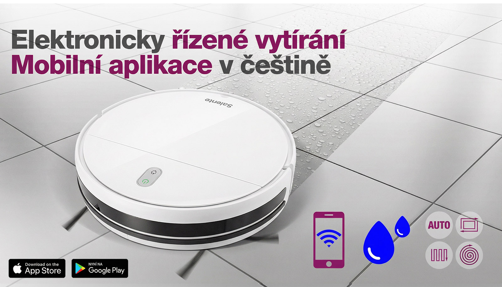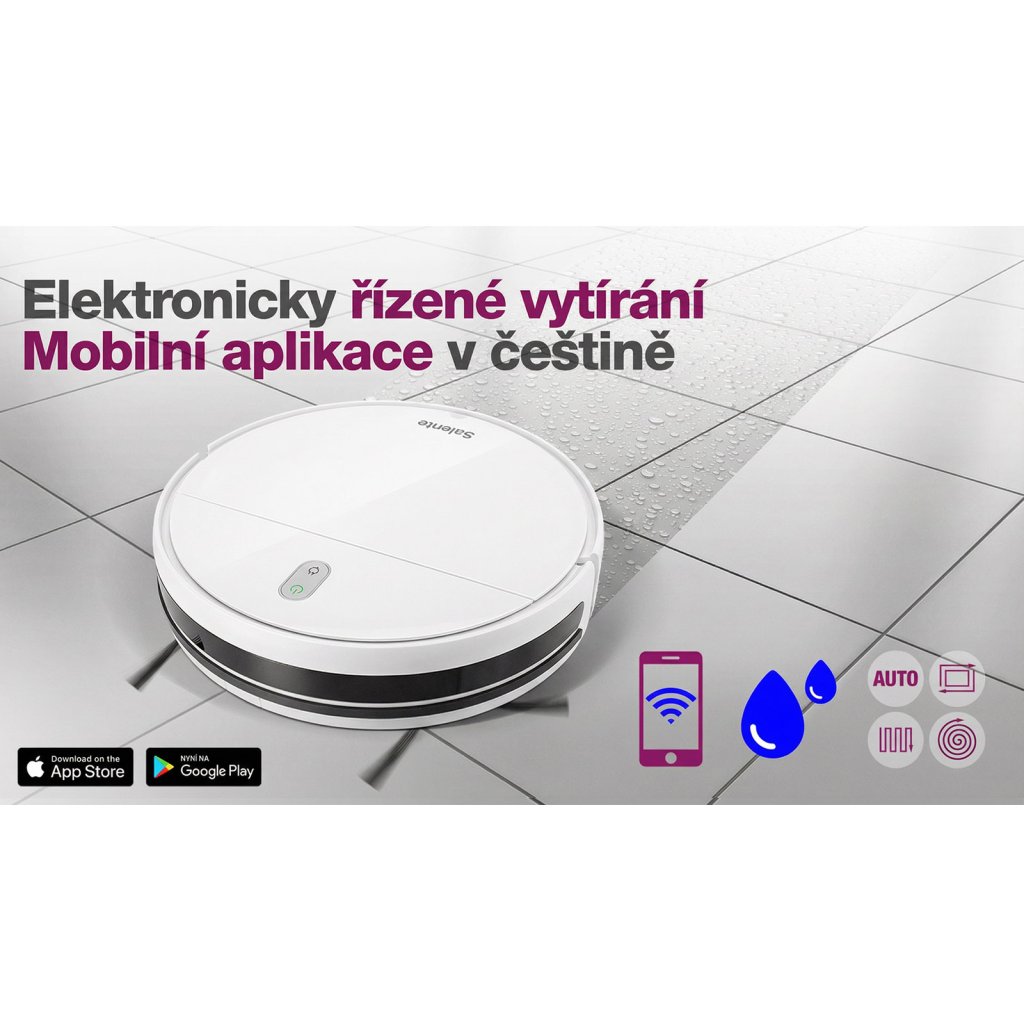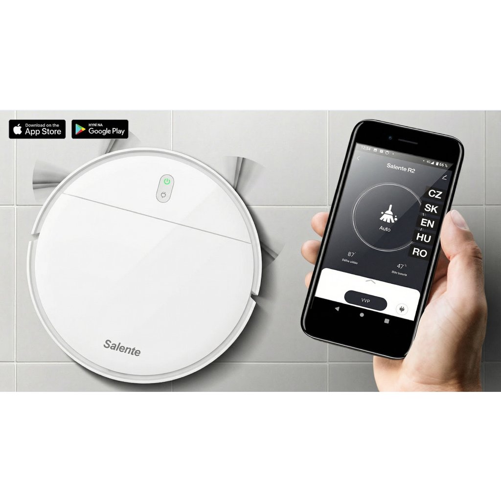 Vysavač Salente R2 s elektronicky řízeným dávkováním vody vysaje a vytře celý váš byt a ještě se poté sám automaticky nabije. Vysavač můžete ovládat pomocí mobilní aplikace v českém jazyce, nabízí čtyři režimy úklidu a je vybaven kvalitní filtrací s HEPA filtrem.